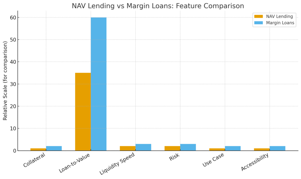 For private market exposure, NAV lending is more tailored. Margin loans suit liquid securities but expose investors to volatility.
